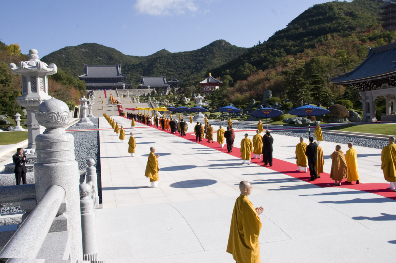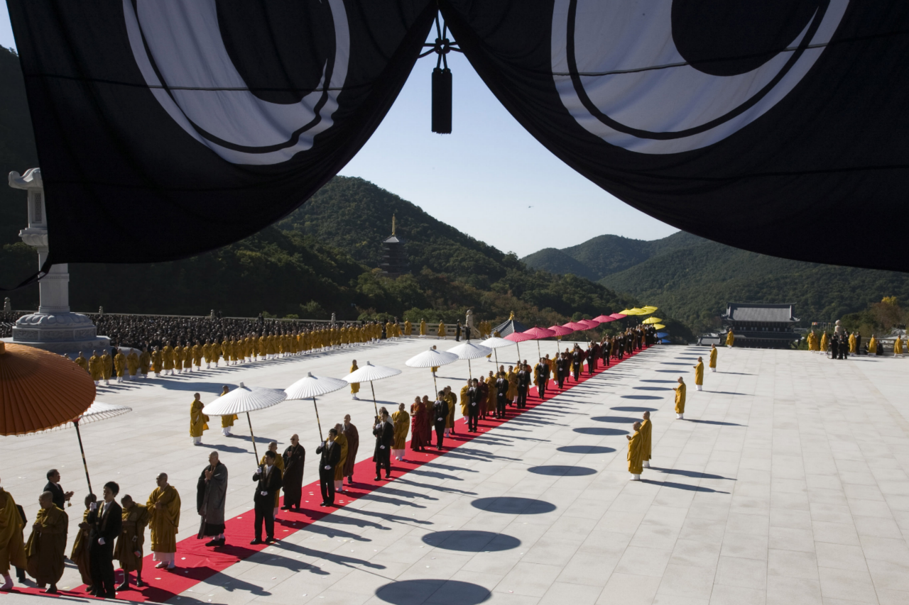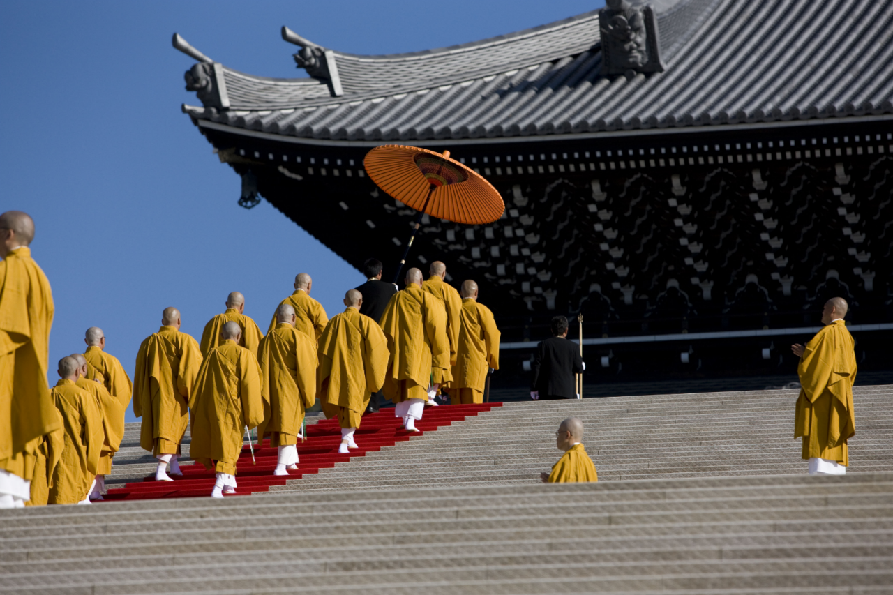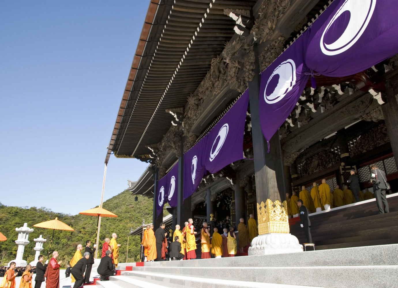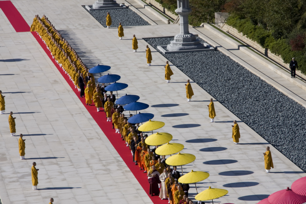 本堂より山門に向けて真一文字に敷かれた緋色の絨毯の上を 仏教最高指導者らによるお練りが 本堂に向かう
