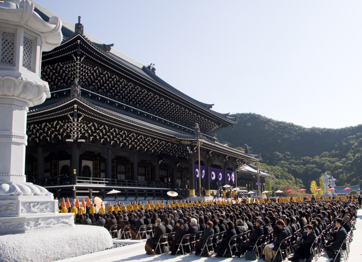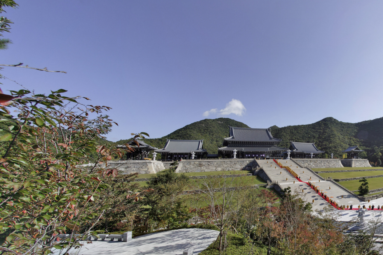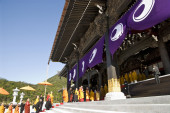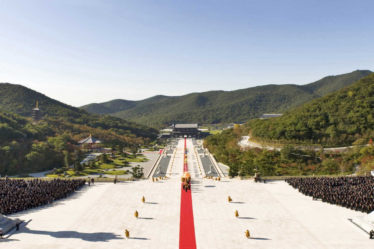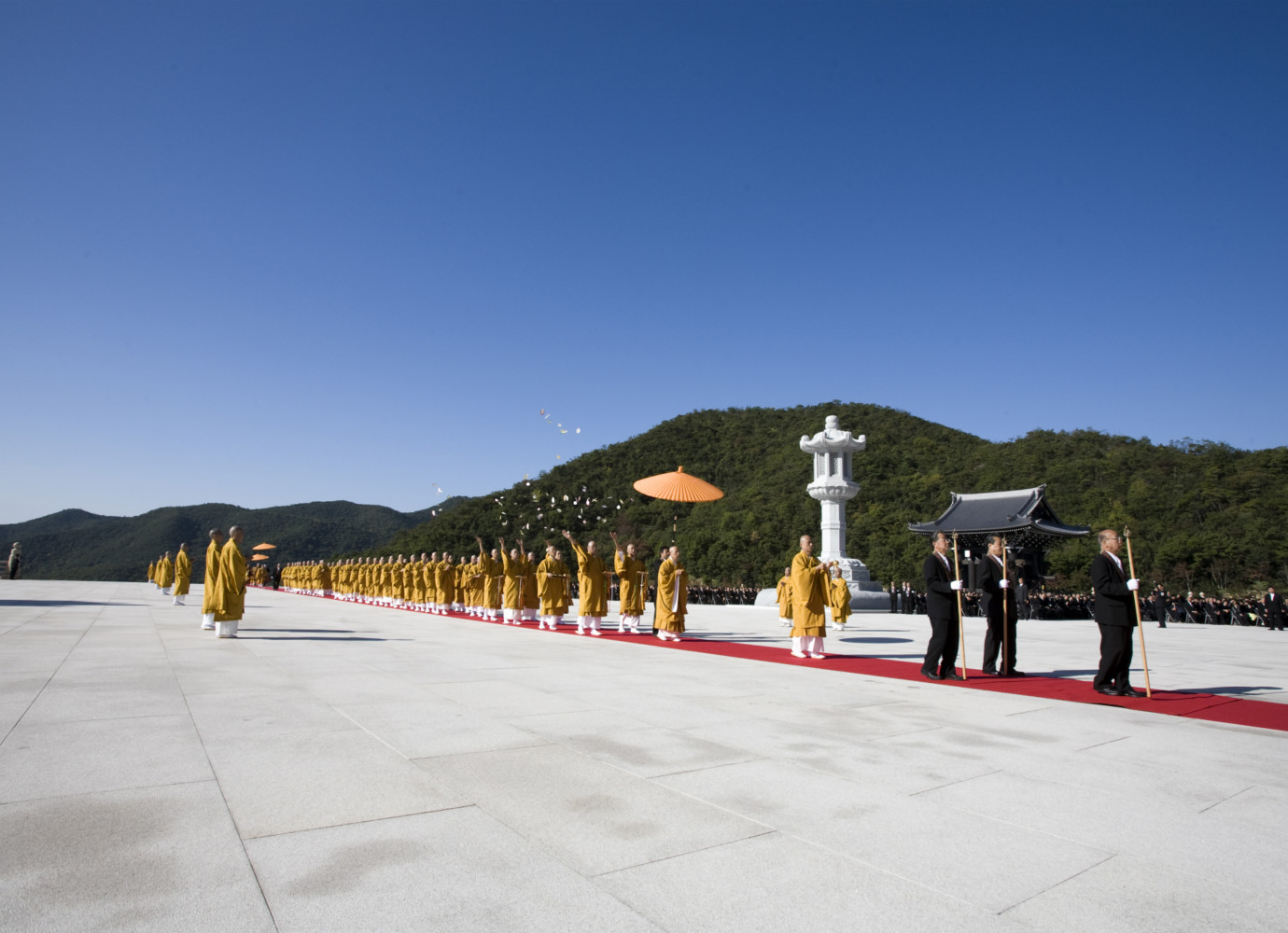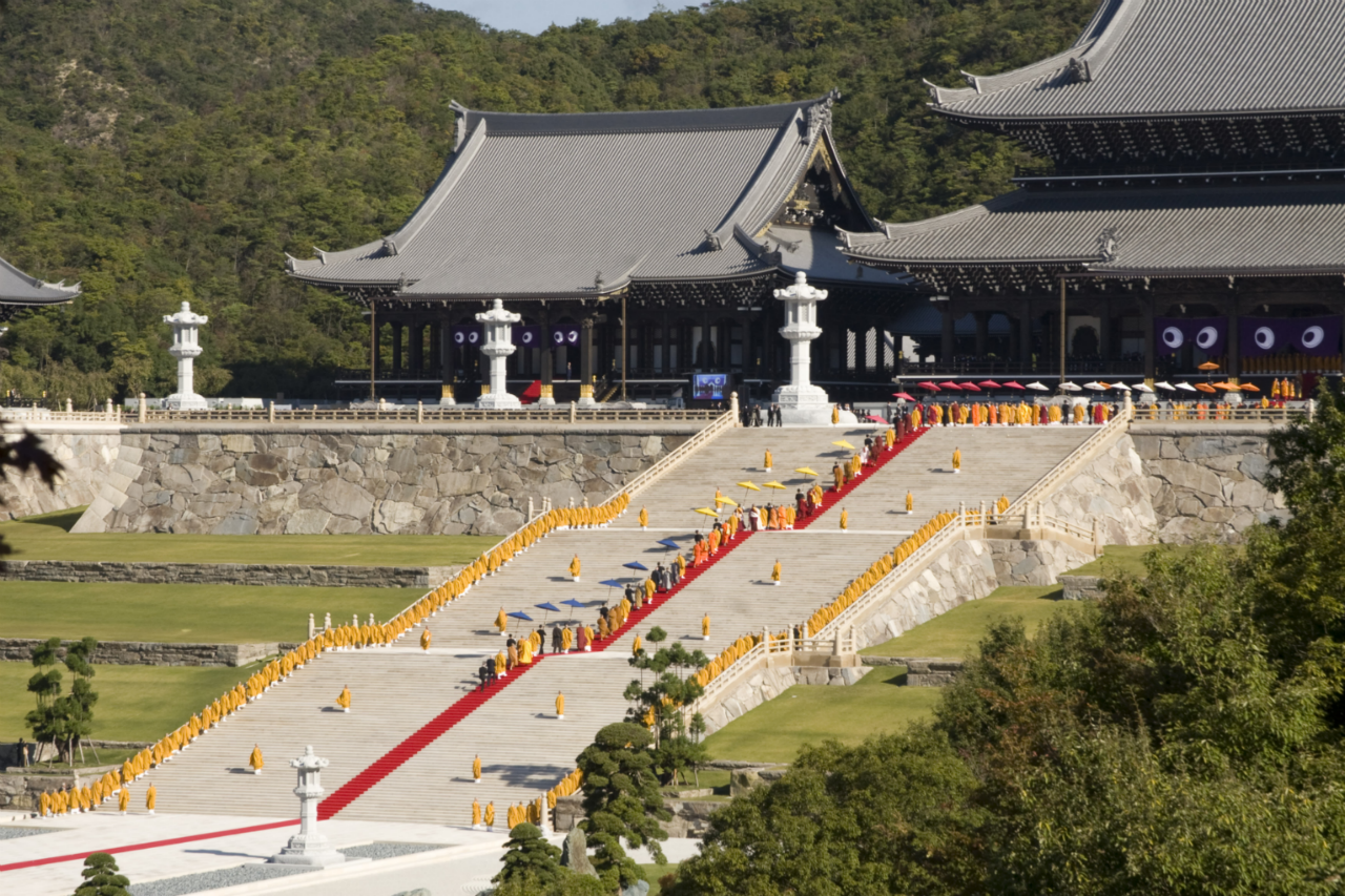 本堂より山門に向けて真一文字に敷かれた緋色の絨毯の上を 仏教最高指導者らによるお練りが 本堂に向かう