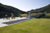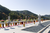 整然と等間隔に屹立する念佛宗僧侶に護られた参道を