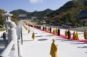 日本晴れのもと 紅葉に彩られた山間の参道を 五色の天蓋と共に 300メートルにも及ぶ 仏教最高指導者による